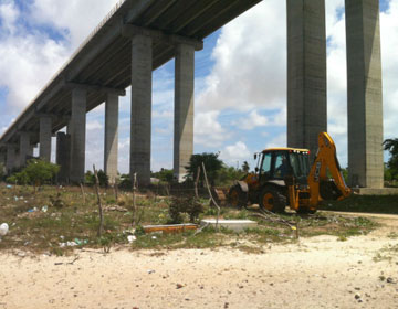 O terreno que vai desde o terminal de ônibus da empresa Guanabara até a cabeceira da ponte, próximo à rotatória, estava sendo loteado há cerca de dois meses com várias cercas, troncos de coqueiro e madeira. O loteamento irregular já subia pelas dunas em direção ao asfalto e do outro lado da ponte, na margem esquerda, as cercas já estavam adentrando pela área de mangue.