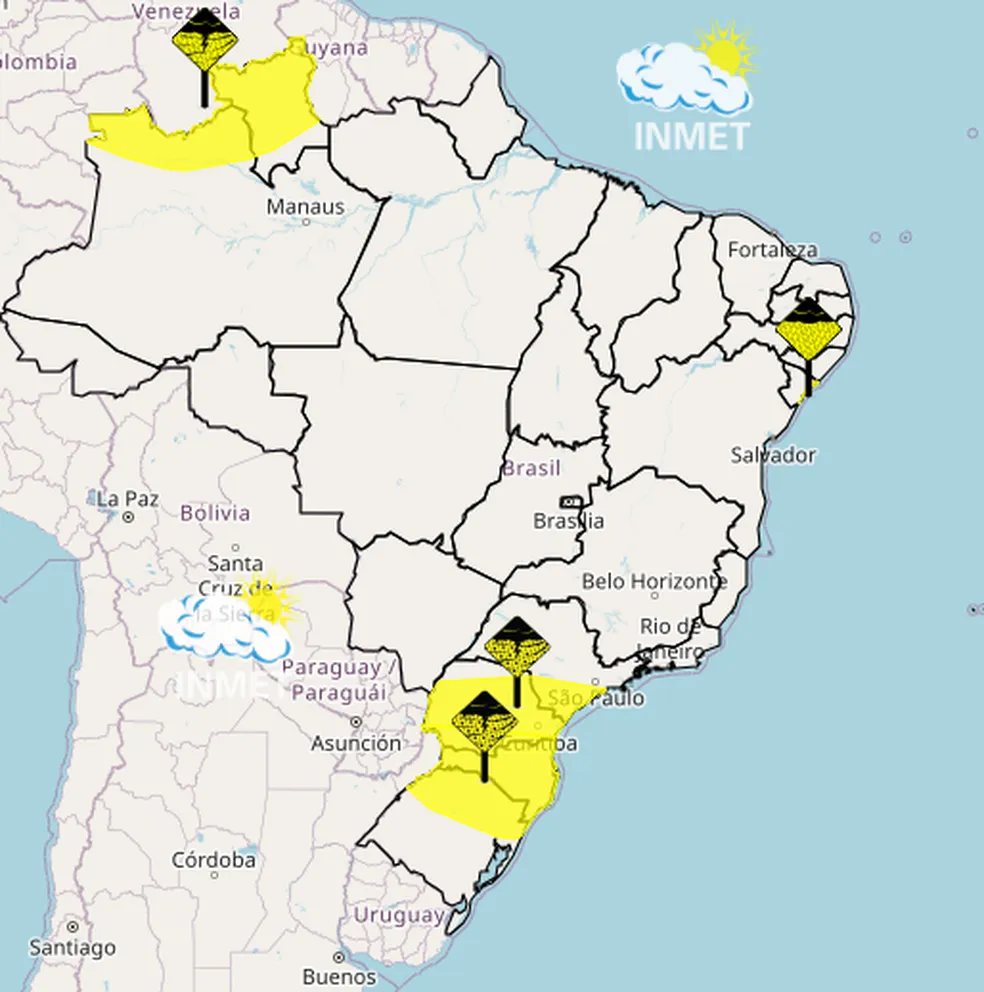 O Instituto Nacional de Meteorologia (Inmet) emitiu um “alerta amarelo” e destacou o “perigo potencial” de tempestades e de chuvas intensas nos seguintes estados: