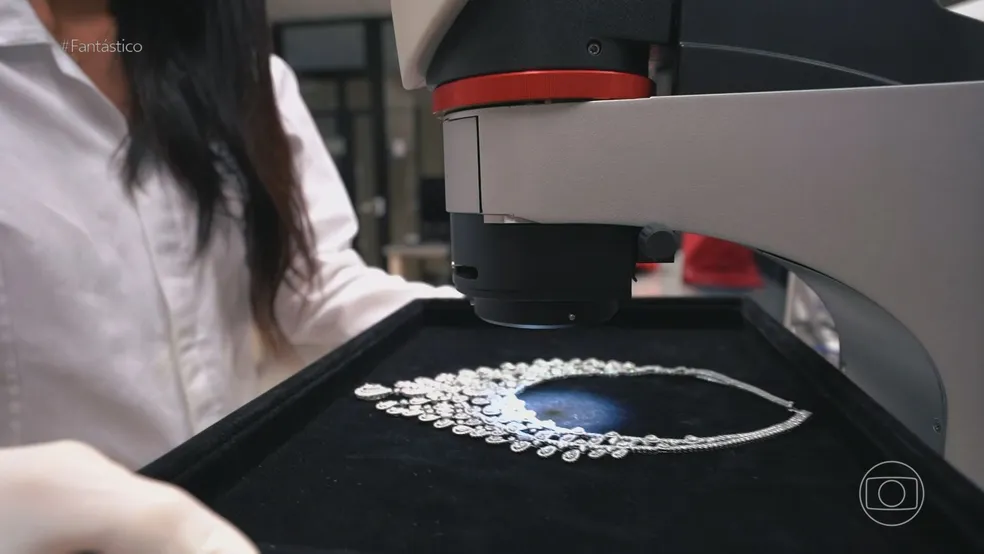 E não é só a qualidade dos diamantes que conta. É também a quantidade, porque não são dezenas ou centenas. São milhares. Só no conjunto que tem o colar, a perícia identificou 3.161 diamantes, cada um avaliado individualmente. A classificação segue um padrão internacional, que avalia claridade, cor, peso, lapidação e o corte do diamante que dá forma à pedra.