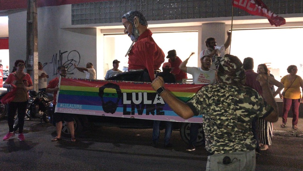 Um carro usado pelo grupo levava um boneco representando o ex-presidente. Fogos de artifício e faixas também foram usados pelos manifestantes, que gritavam “Lula, guerreiro do povo brasileiro”.
