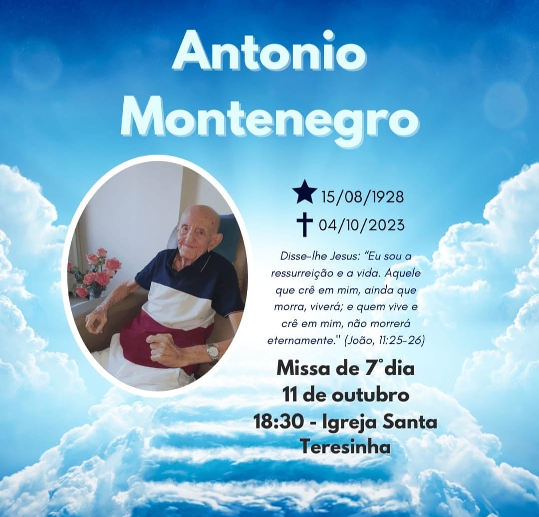 A missa de sétimo dia de Antonio Montenegro será realizada nesta quarta-feira (11), às 18h30min, na Igreja Santa Teresinha, no bairro de Tirol.