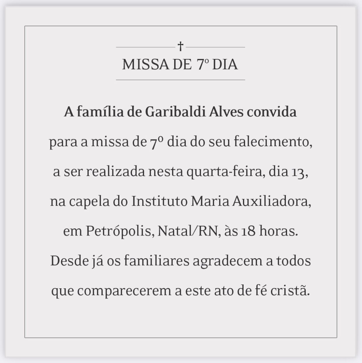 Nesta quarta-feira (13), a família de Garibaldi Alves realiza uma missa de 7° dia de seu falecimento.