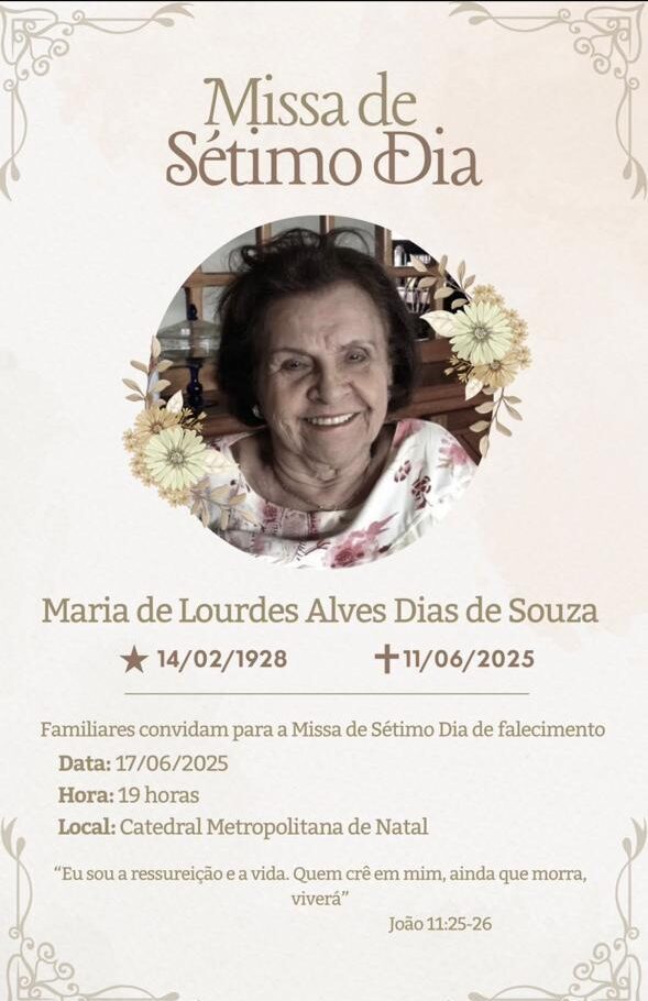 Hoje (17) será realizada a missa de sétimo dia de falecimento de Maria de Lourdes Alves Dias de Souza, às 19h na Catedral Metropolitana de Natal.