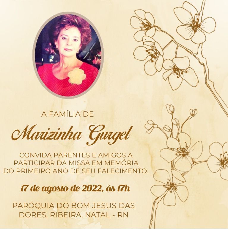 Hoje (17) acontece a missa de um ano de falecimento de Marizinha Gurgel, que será realizada às 17h na Paróquia do Bom Jesus das Dores, no bairro da Ribeira, Natal-RN.
