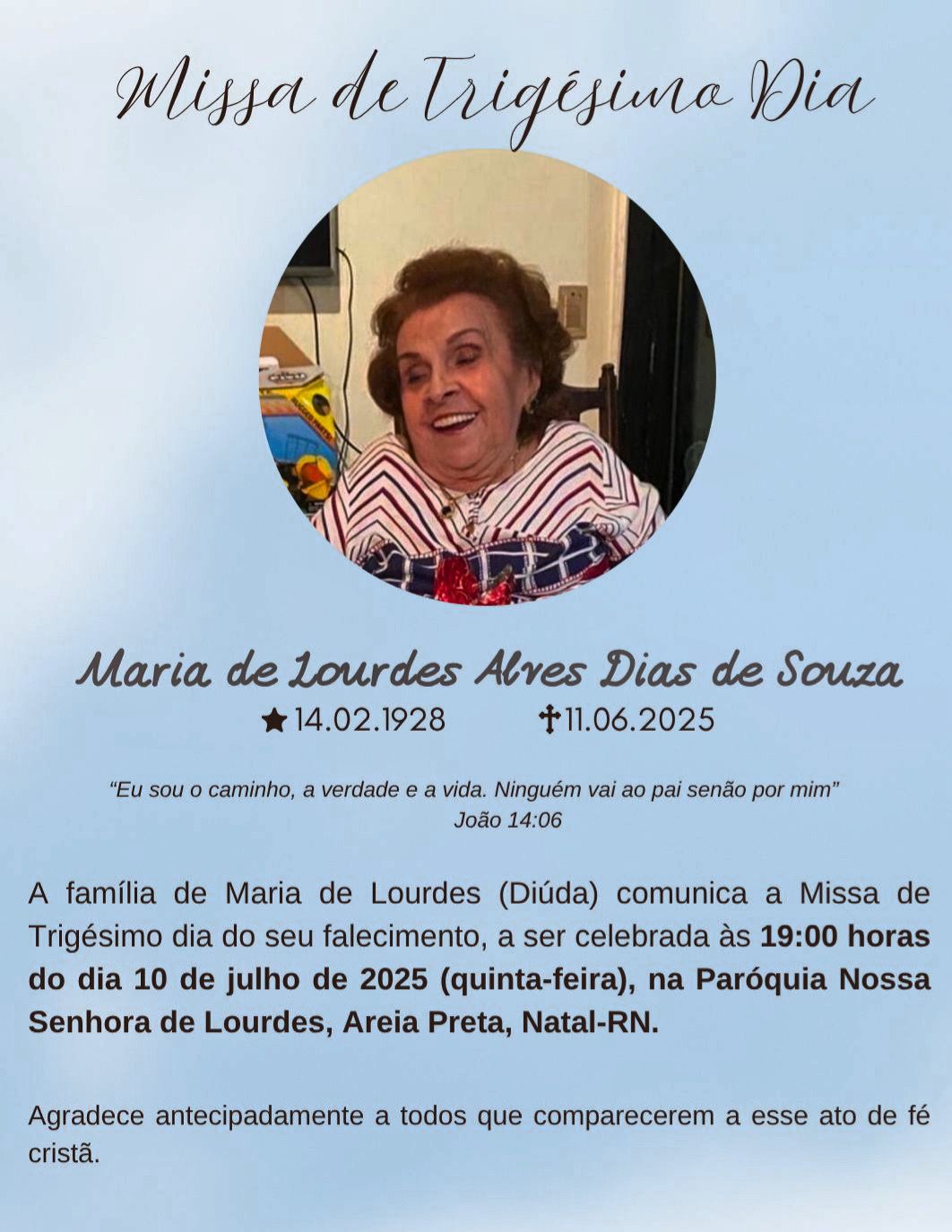 Nesta quinta-feira (10) será realizada a missa de trigésimo dia em alusão ao falecimento de Maria de Lourdes Alves Dias de Souza, às 19h na Paróquia Nossa Senhora de Lourdes, no bairro de Areia Preta.
