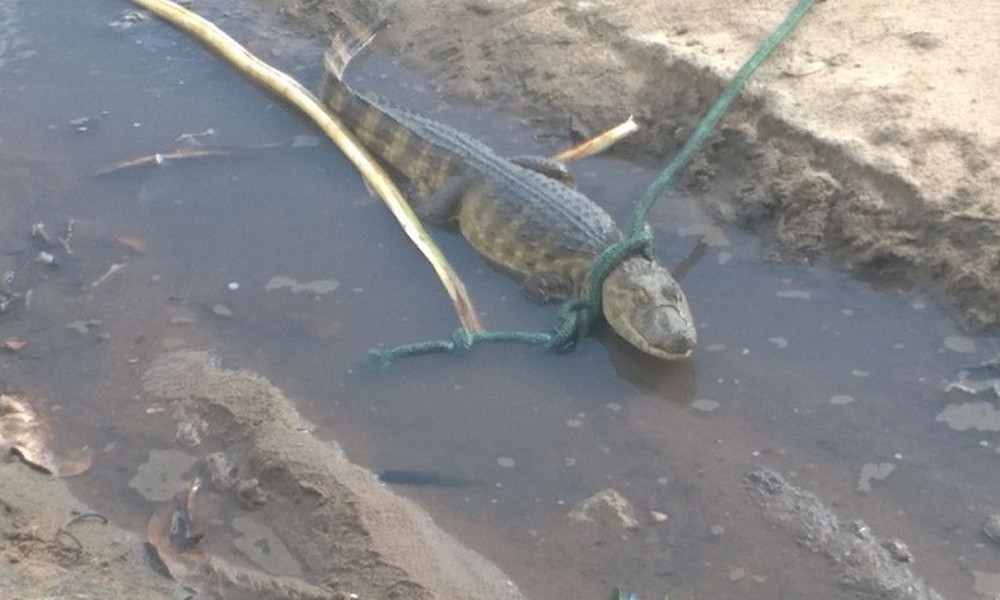 Após visualizar e neutralizar o réptil, amarrando-o com uma corda, a população acionou o Corpo de Bombeiros. Uma equipe se deslocou para o local por volta das 14h40.