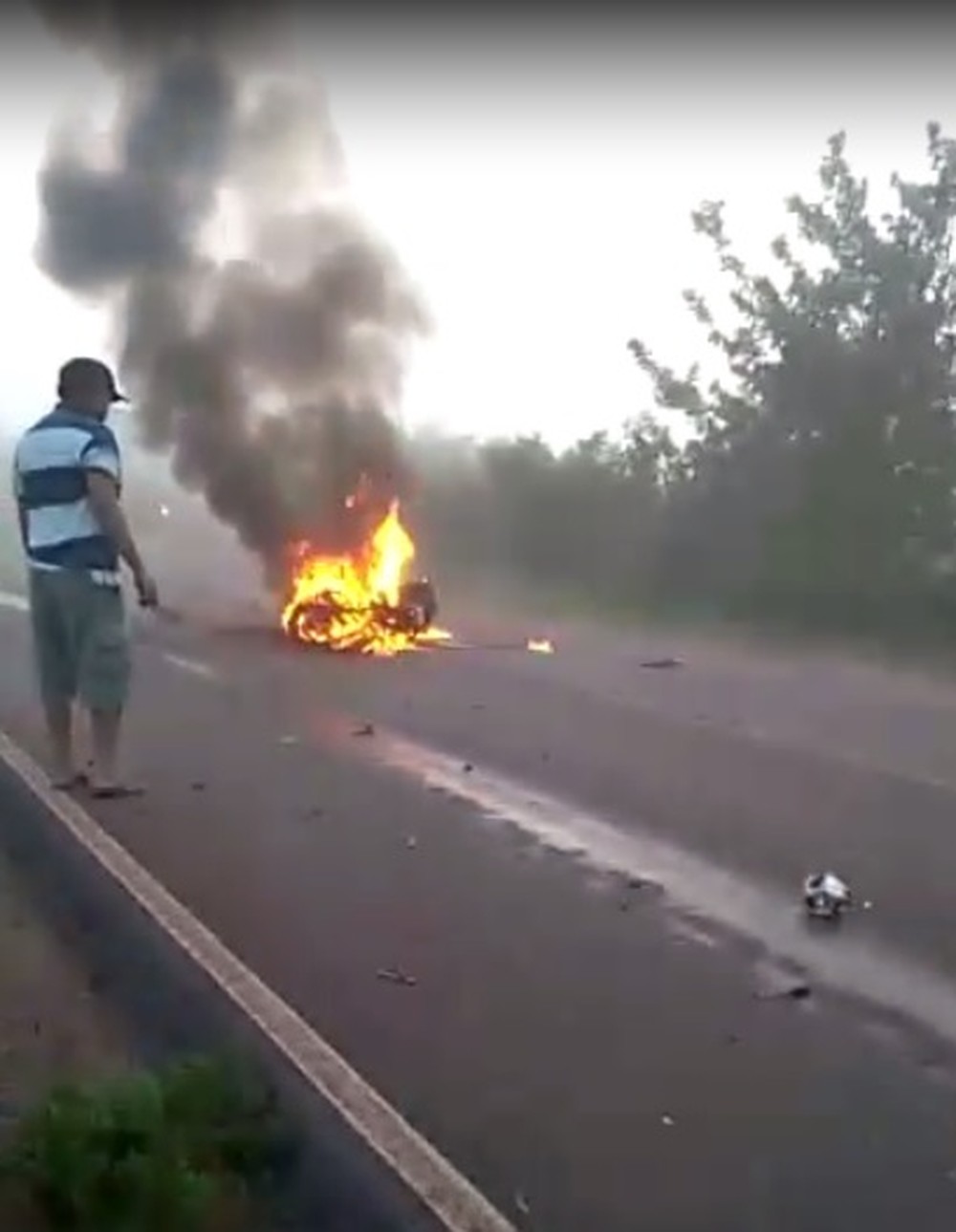 Segundo a Polícia Rodoviária Federal (PRF), uma moto e um carro bateram de frente. Com o impacto da batida, o condutor da moto foi arremessado na pista. A moto pegou fogo e o trânsito ficou parado no local.