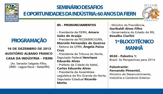 O seminário Motores do Desenvolvimento chegou hoje (16) à sua 19ª edição. O encontro, que é o terceiro do ano, vai debater os Desafios e Oportunidades da Indústria, fazendo a relação com os 60 anos da Federação das Industrias do Rio Grande do Norte. Para o encontro, foram convidados o ministro do Desenvolvimento, Indústria e Comércio Exterior, Fernando Pimentel, o presidente da Confederação Nacional da Indústria, Robson Braga de Andrade, além de empresários e autoridades no assunto.