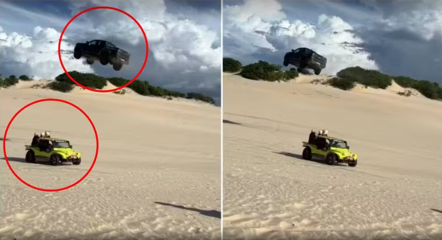 Na manobra, a picape preta acelerou e subiu a duna até voar por cima do buggy amarelo, que estava parado com o grupo de turistas. O carro chegou ao chão com os quatro pneus danificados e o sistema de airbag inflado.