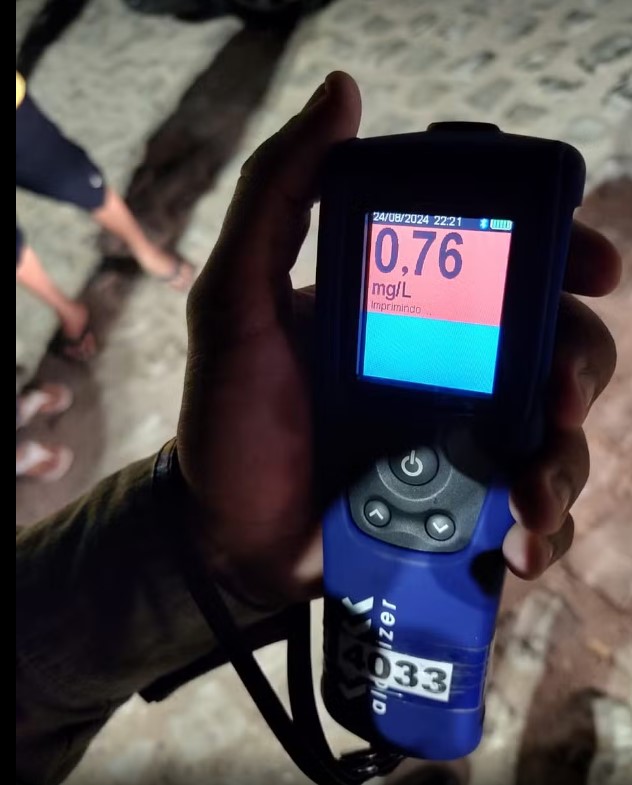 O primeiro teste apontou 0,69 mg/L, o que já é considerado crime de trânsito. Minutos depois, no entanto, um novo teste revelou um aumento para 0,76 mg/L. O infrator foi preso por embriaguez ao volante e conduzido à Delegacia de Plantão.
