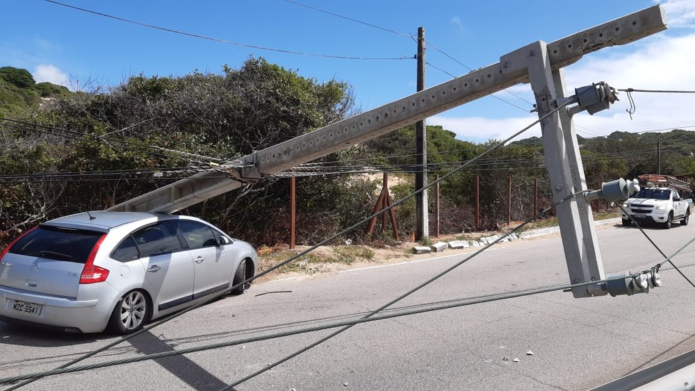 Por causa da queda do primeiro poste, a cruzeta (parte que segura os fios) de outro poste caiu sobre outro veículo que seguia no mesmo sentido, atingindo o para-brisa traseiro.