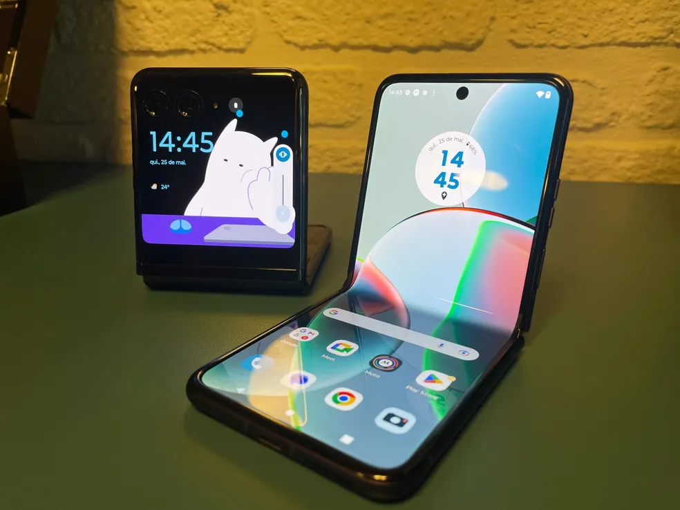 Como o próprio nome sugere, o Razr 40 Ultra é o mais avançado da linha. Ele tem uma tela pOLED (dobrável) de 6,9 polegadas e uma externa de 3,6 polegadas com taxa de atualização de até 144 Hz, que deixa a navegação mais rápida.