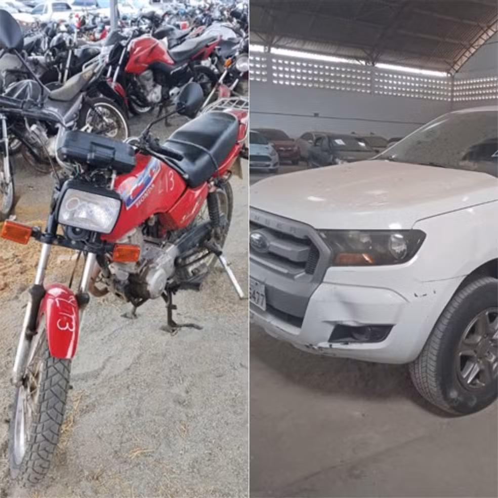 Entre os veículos em leilão estão um Fiat Fastback Audace, 2022/2023, com lance inicial de R$ 60 mil, e uma Ford Ranger, 2018, com lance inicial de R$ 40 mil, além de motocicletas com valores iniciando em R$ 600,00.