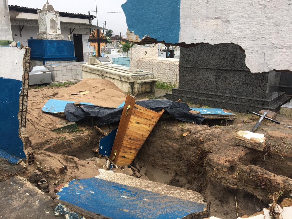 Um corpo que tinha sido enterrado no cemitério de Parnamirim, na região metropolitana de Natal, ficou exposto após o muro do local desabar e a força da água que alagava a rua abrir algumas das covas. A capital registrou 122 milímetros em 12 horas, segundo o Centro Nacional de Monitoramento e Alertas de Desastres Naturais (Cemaden).