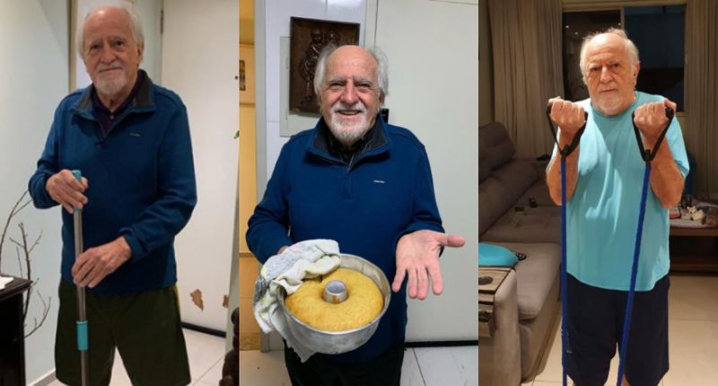 Aos 87 anos, o ator Ary Fontoura está aproveitando a quarentena em casa para se manter o mais ativo possível. Para isso, ele faz de tudo, lava roupa, limpa a casa, cozinha, malha. Com um sorriso sempre no rosto, até a receita do bolo que está preparando Fontoura deixa para seus fãs.
