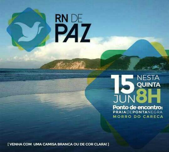 Na manhã de hoje o natalense participou do evento intitulado Um manifesto pela paz! A manifestação pela paz ocorreu na na praia de Ponta Negra próximo ao Morro do Careca. O evento simbólico foi uma iniciativa das ONGs Alefe, Nativa, PaisBrasil e JWBrasil, e com o apoio da OPEN (Ordem de Pastores de Natal) e do OBVIO (Observatório da Violência Letal Intencional no Rio Grande do Norte), como forma de protesto pacífico contra violência em curso no Estado. A partir de hoje será desencadeada uma série de eventos sem conotações político partidárias e com viés exclusivamente social, conclamando segmentos da sociedade civil organizada a agir para concretizar o sonho de paz que todos almejam.