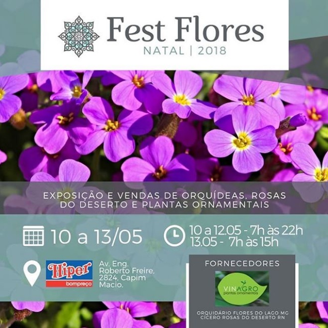 A partir do dia 10 até o dia 13 de maio, Natal recebe um grande evento de flores, no Hiper Bompreço – Capim Macio. A 1ª edição do Fest Flores Natal traz à capital potiguar uma exposição e venda com mais de cinco mil exemplares de flores, entre orquídeas, rosas do deserto e plantas ornamentais. Momento ideal para encontrar o presente para o Dia das Mães.