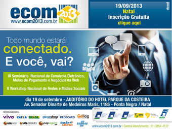 Natal sedia nesta quinta-feira (19) o ECOM 2013 – III Seminário Nacional de Comércio Eletrônico, Negócios na Web e Meios de Pagamento. O evento acontece no auditório do hotel Parque da Costeira – Via Costeira. Com entrada gratuita para os inscritos através do site www.ecom2013.com.br, a iniciativa, que acontece pela terceira vez na capital potiguar, percorrerá no seu total as 12 cidades-sede da Copa do Mundo de Futebol em 2014, além das capitais Belém e Florianópolis, até novembro.