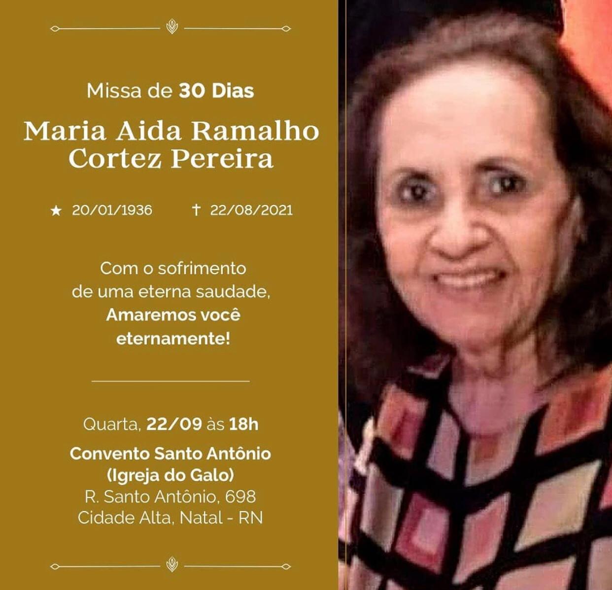Nesta quarta-feira (22) ocorre a missa de 30 dias de Maria Aida Ramalho Cortez Pereira.