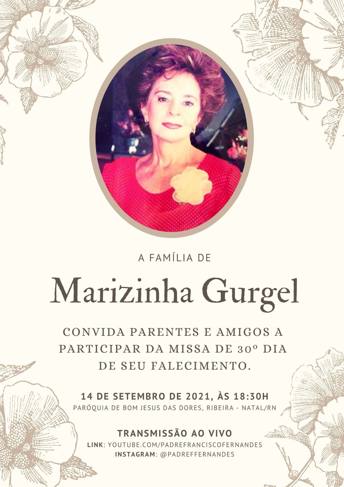 Nesta terça-feira (14) será realizada a missa de 30º dia de falecimento de Marizinha Gurgel, às 18h30min na Paróquia de Bom Jesus das Dores, na Ribeira. A missa também poderá ser acompanhada em formato online através do YouTube do Padre Francisco Fernandes e em sua conta do Instagram.