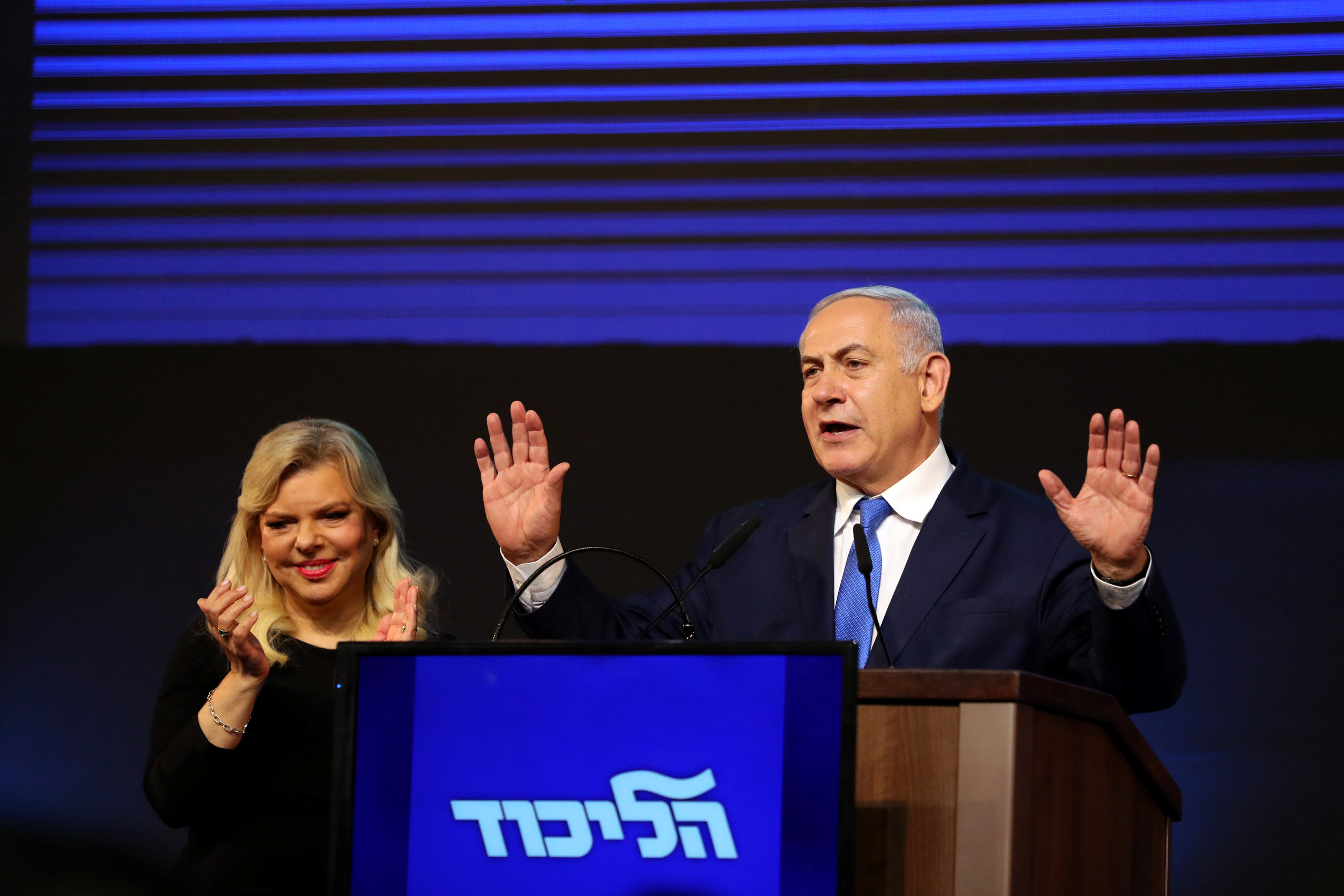 Israeli Prime Minister Benjamin Netanyahu and his wife Sara gesture as Netanyahu speaks following the announcement of exit polls in Israel's parliamentary election at the party headquarters in Tel Aviv, Israel April 10, 2019. REUTERS/Ammar Awad