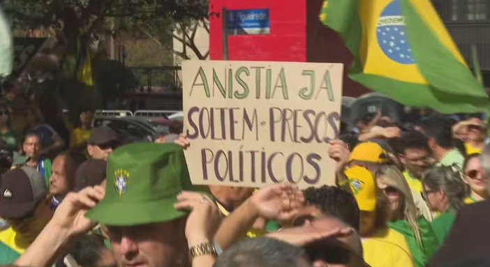 Os apoiadores do ex-presidente levaram faixas e cartazes com críticas ao Supremo Tribunal Federal (STF) e pedidos de anistia aos condenados pela tentativa de golpe de Estado em 8 de janeiro de 2023, medida que pode beneficiar Bolsonaro.
