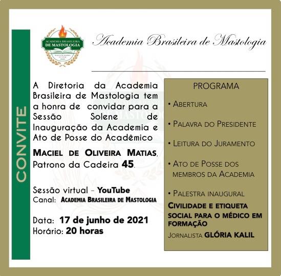 A diretoria da Academia Brasileira de Mastologia realiza sessão solene de inauguração da Academia e ato de posse do acadêmico Maciel de Oliveira Matias, patrono da cadeira 45, nesta quinta-feira (17), às 20h. A sessão será virtual e pode ser acessada via YouTube.