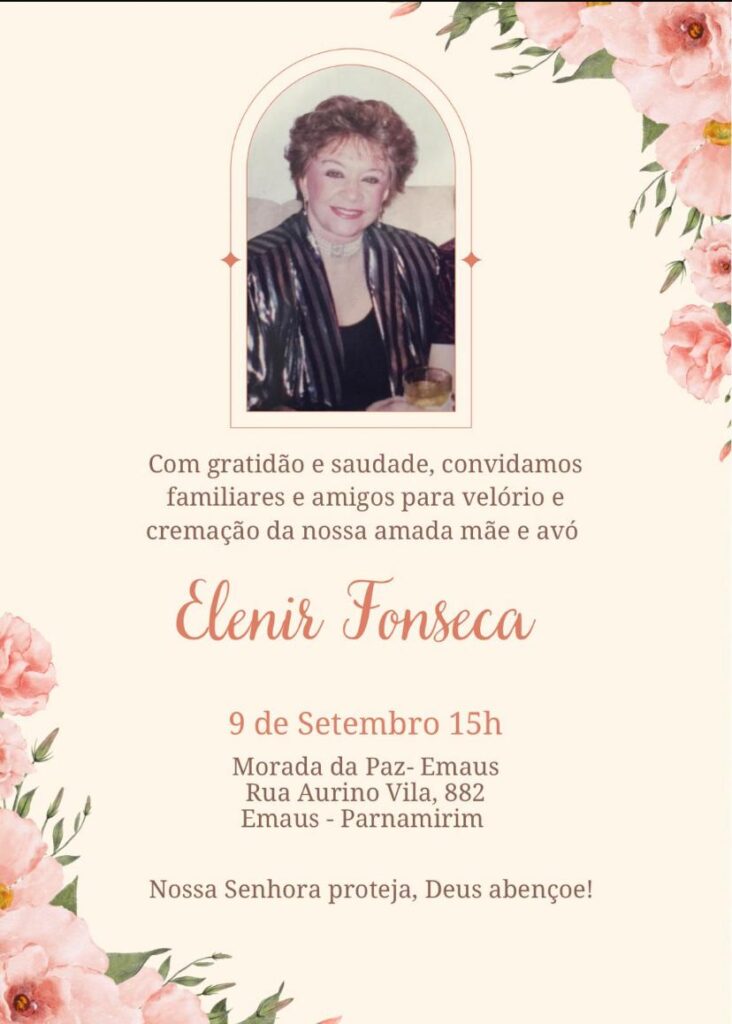 Nós que fazemos o Blog Ponto de Vista prestamos nossos sentimentos aos familiares e amigos de Maria Elenir Medeiros da Fonseca, mais conhecida como Elenir Fonsenca, falecida aos 94 anos. El partiu, nessa segunda-feira (08), em seu apartamento na Praia de Areia Preta, em Natal, no edifício que leva o seu nome.