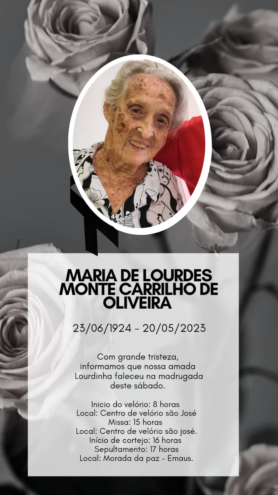 Nós que fazemos o Blog Ponto de Vista prestamos nossos sentimentos aos familiares e amigos de Maria de Loures Monte Carrilho de Oliveira, falecida no último sábado (20).