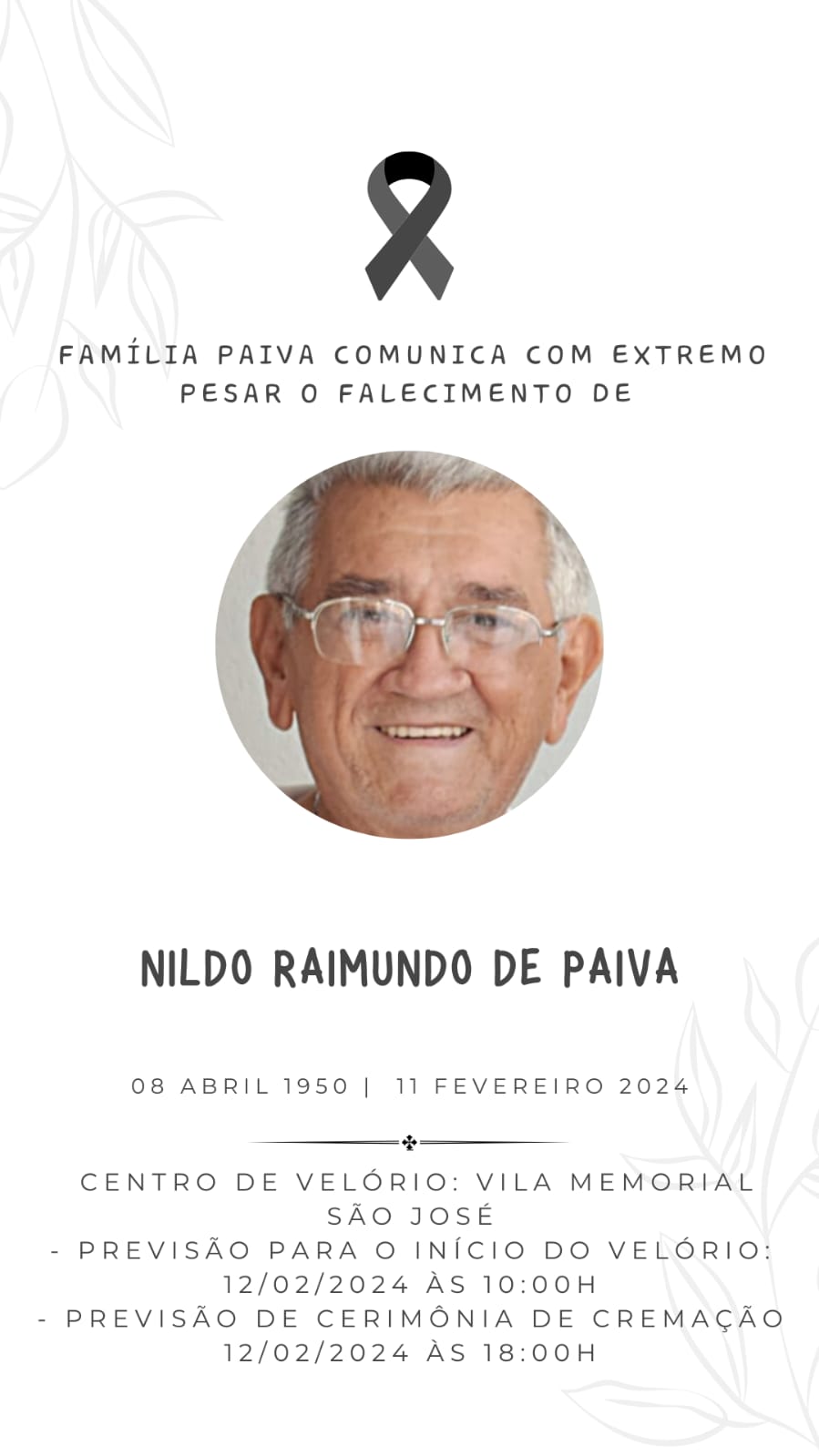 Nós que fazemos o Blog Ponto de Vista prestamos nossos sentimentos aos familiares e amigos de Nildo Raimundo de Paiva, falecido nesse domingo (11). O velório será nesta segunda-feira (12), às 10h no Centro de Velório: Vila Memorial São José. A cremação está marcada para às 18h.