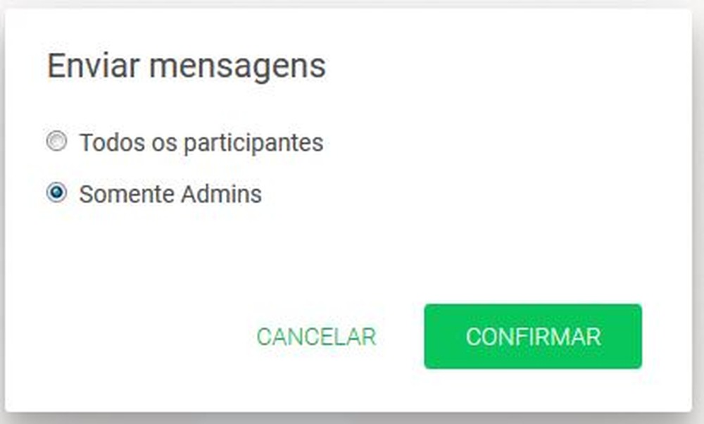 Para habilitar a função, é necessário ir em “Informações do grupo”, depois “Configurações do Grupo”, em seguida “Enviar mensagens”. Por fim, selecione “Somente Admins” e clique em “Confirmar”.
