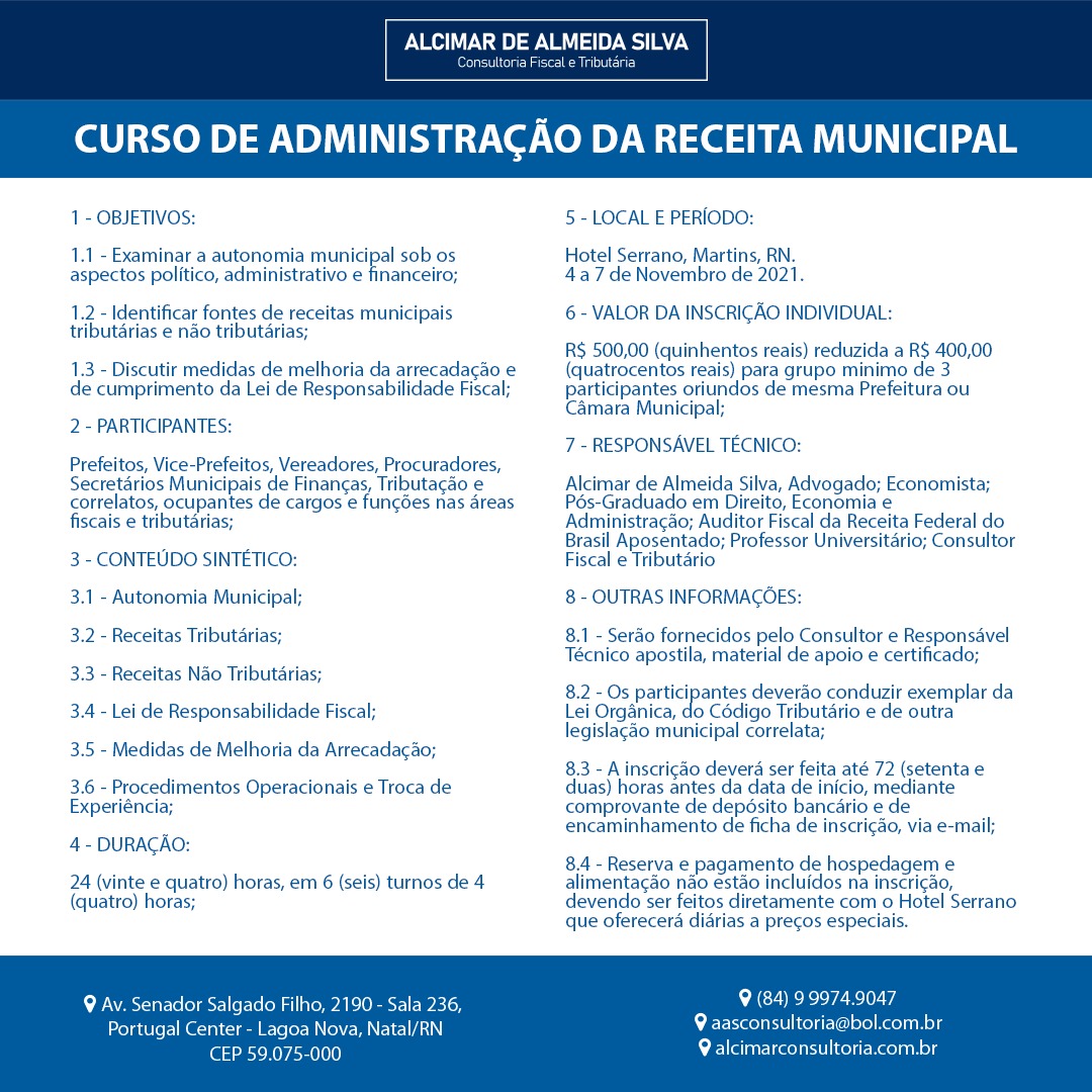 A fim de planejamento do Curso de Administrativo da Receita Municipal, a ser ministrado sob nossa responsabilidade técnica no Hotel Serrano em Martins, no período de 4 a 7 de novembro de 2021, inclusive para habilitar a tarifa especial de hospedagem, produção de material e outros, solicitamos das Prefeituras e Câmaras Municipais informarem o número de seus participantes, inclusive porque há necessidade de bloquear apartamentos.