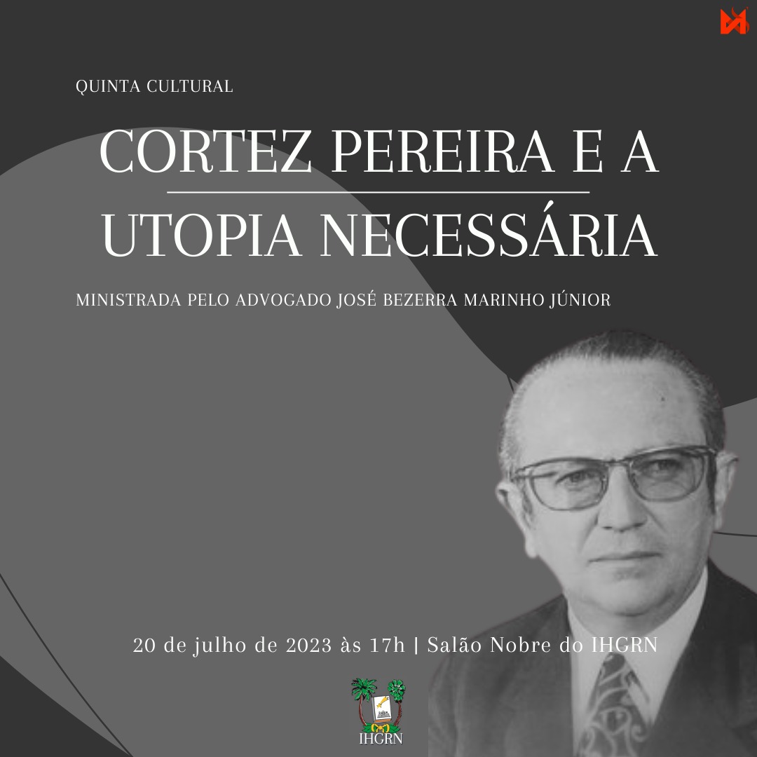 Na quinta cultural do Instituto Histórico Geográfico do Rio Grande do Norte (IHGRN), o tema da palestra será “Cortez Pereira e a Utopia Necessária”, ministrada pelo advogado José Bezerra Marinho Júnior, às 17h no Salão Nobre do IHGRN.