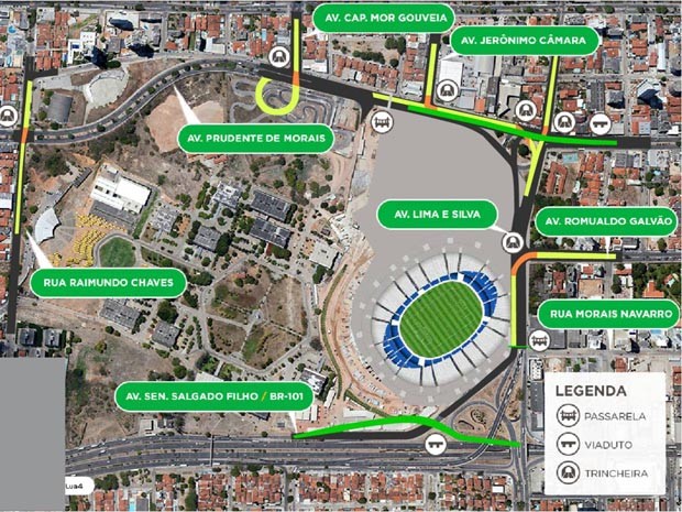 As obras de mobilidade urbana no entorno da Arena das Dunas, no bairro de Lagoa Nova, zona Sul de Natal, e os desvios no trânsito começam nesta segunda-feira (21) com a instalação dos canteiros e do pátio industrial. Serão construídos seis túneis, dois viadutos, sendo um estaiado, e duas passarelas na região. Na sexta-feira (18), os secretários de Mobilidade Urbana, Elequicina Santos, Obras Públicas e Infraestrutura, Tomaz Neto, e os adjuntos de Planejamento Instrumental, Alexandre Duarte, e de Trânsito, Walter Pedro, explicaram cada intervenção e solicitaram a compreensão e paciência da população por causa dos transtornos provocados pelas obras. Eles lembraram que, apesar do contratempo temporário, elas vão contribuir para a melhoria do trânsito na área, não apenas durante a Copa do Mundo de 2014, mas de forma permanente. A segunda etapa prevê a construção de túnel nas avenidas Romualdo Galvão, Lima e Silva, Jerônimo Câmara e Capitão-Mor Gouveia. Mais um túnel será construído na rua Raimundo Chaves, correspondendo à terceira etapa. A última etapa compreende a construção do segundo viaduto ligando a marginal da BR-101. O conjunto está orçado em R$ 222,5 milhões, vai envolver cerca de 1.200 operários trabalhando em três turnos e o prazo de conclusão é maio de 2014.