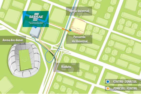 Os clientes que necessitam chegar ao Sebrae/RN devem seguir na Avenida Salgado Filho, sentido Centro-Zona Sul, passando por baixo do viaduto. Em seguida, é necessário entrar na alça do Quarto Centenário, como se fosse em direção à Arena das Dunas, prosseguindo até a lateral do estádio, que fica em frente ao prédio do Sebrae. Todo o percurso está sinalizado com placas indicativas.
