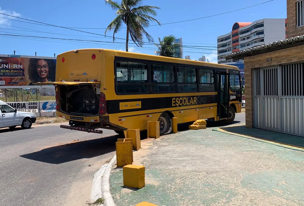Um ônibus escolar que transportava estudantes para a realização do Exame Nacional do Ensino Médio (Enem) bateu na proteção de ferro de uma calçada no bairro da Praia do Meio, na Zona Leste de Natal. Ninguém ficou ferido.