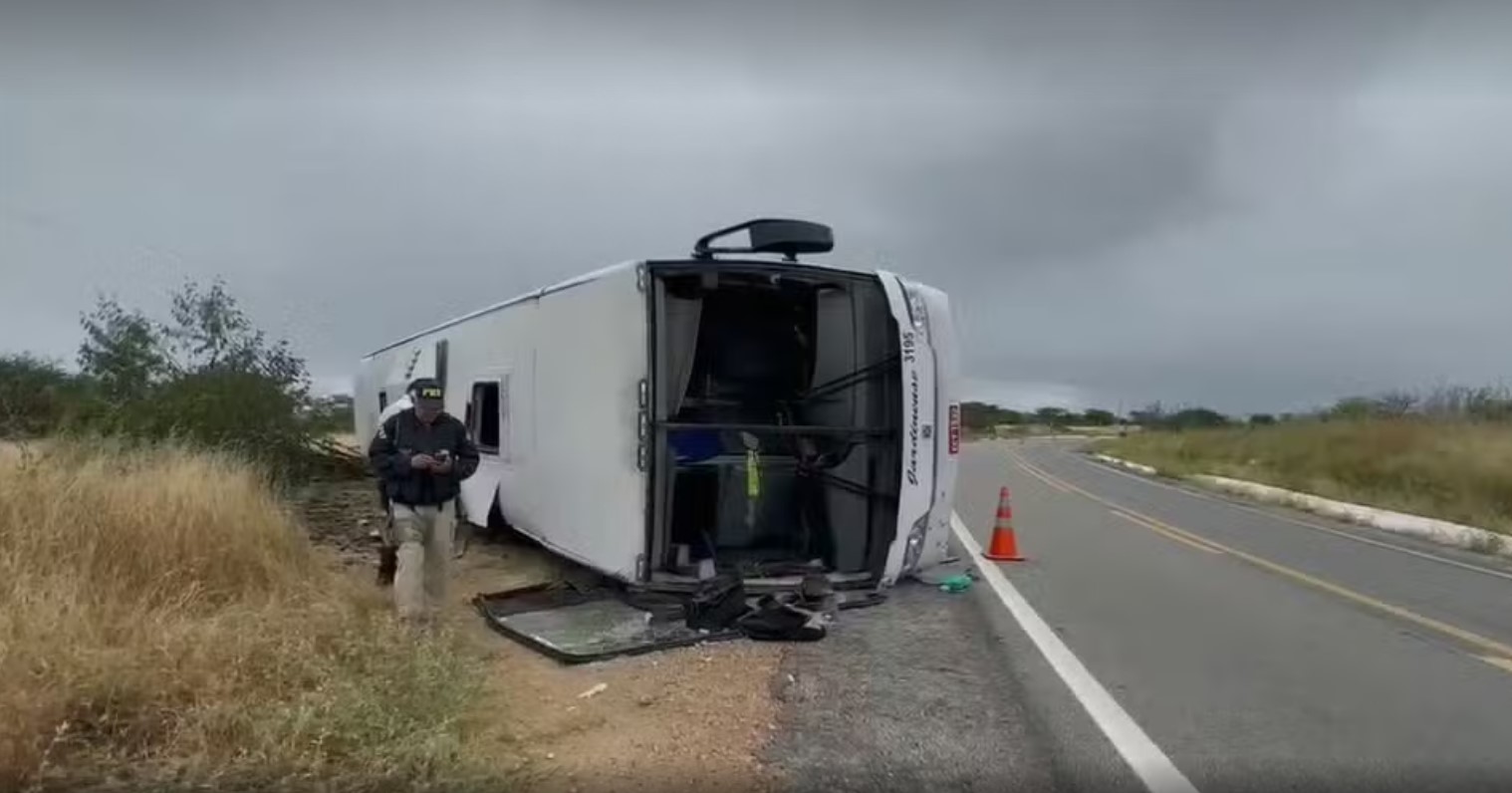 Um ônibus tombou para fora da pista no fim da manhã desta segunda-feira (3) ao tentar fazer uma curva na BR-427 no município de Jardim do Seridó, no interior do Rio Grande do Norte, e deixou passageiros feridos.