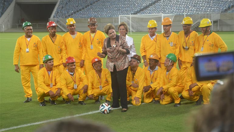 Um grupo de 13 operários comemorou no início da tarde desta quarta-feira (22) a inauguração do estádio Arena das Dunas em Natal. Vestidos com o macacão da obra que usaram durante dois anos e cinco meses, os operários tiraram fotos com a presidente Dilma Rousseff (PT) e conversaram com a imprensa. Hoje (23), os trabalhadores do Arena das Dunas irão participar de uma confraternização dos operários que trabalharam em sua construção, acompanhado das suas famílias. No mesmo dia, haverá ainda o descerramento da placa com todos os nomes dos trabalhadores e no dia 26 de janeiro, a Arena das Dunas receberá dois jogos: América e Confiança, pela Copa do Nordeste, e ABC e Alecrim, pelo Campeonato Estadual.