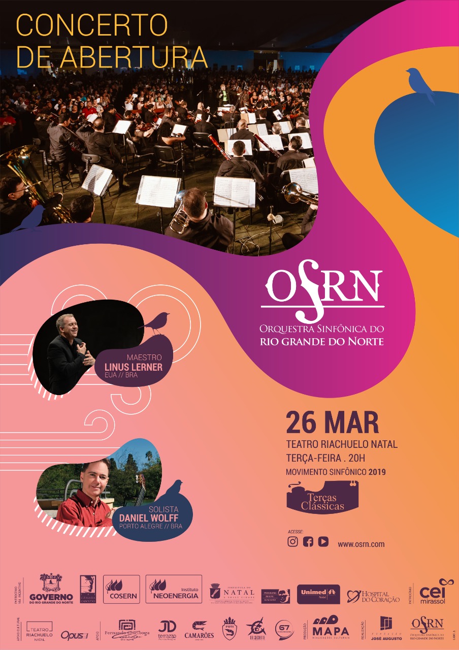 Patrimônio cultural do Rio Grande do Norte, reconhecida pela qualidade e profissionalismo que expõe ao público, a Orquestra Sinfônica do RN – OSRN, faz abertura da temporada 2019 com o “I Concerto do Projeto Movimento Sinfônico – Terças Clássicas”, neste dia 26 de março, no Teatro Riachuelo. A entrada é gratuita e a distribuição do 2º lote de ingressos ocorre no dia do concerto, no 3º piso do Midway Mall, na galeria Fernando Chiriboga, a partir das 10h.