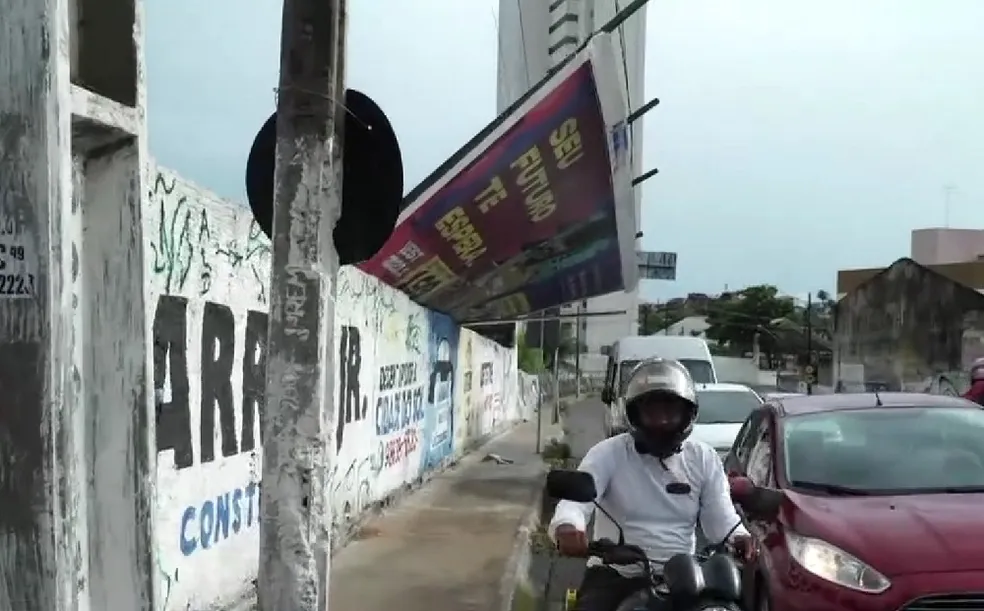 As imagens foram registradas pela reportagem da Inter TV Cabugi que passava pelo local. Motoristas que perceberam a placa pendurada sobre a calçada e a rua temiam que ela desabasse sobre pedestres ou veículos.