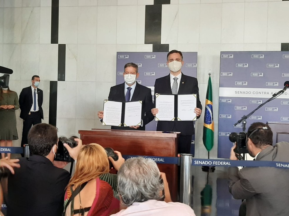 Os novos presidentes do Senado e da Câmara, Rodrigo Pacheco (DEM-MG) e Arthur Lira (PP-AL), apresentaram nesta quarta-feira (3) medidas que consideram prioritárias para o país, como um auxílio financeiro para a população pobre, e assinaram um documento em que reforçam a intenção de dar agilidade à vacinação contra a Covid-19.