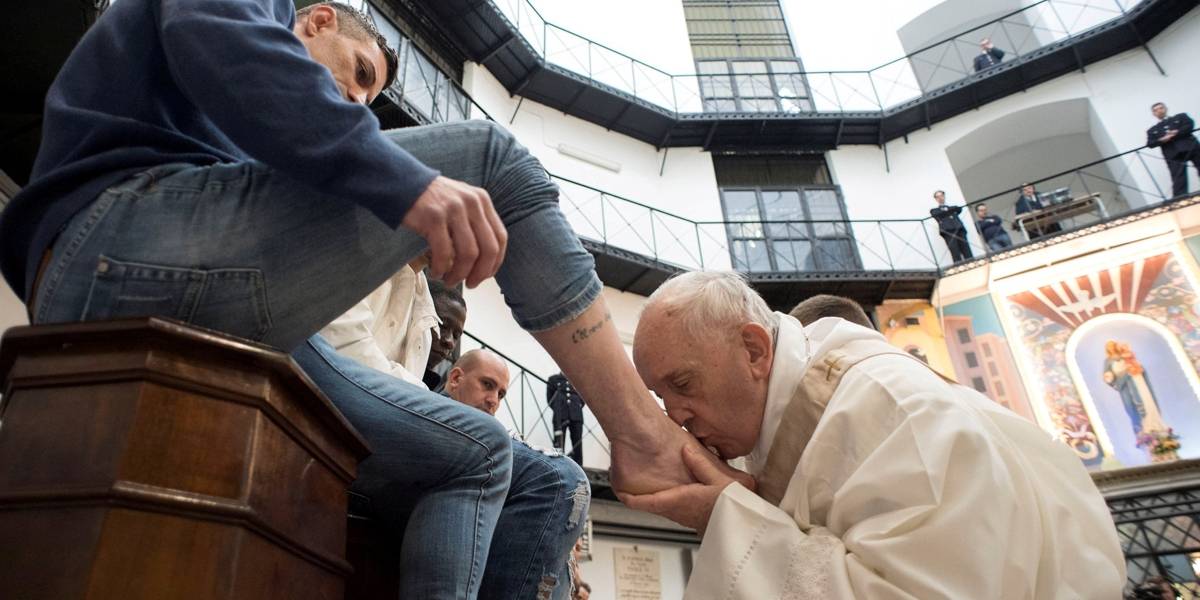 O papa Francisco celebrou ontem a tradicional missa de Lava-Pés na penitenciária Regina Coeli, a maior de Roma. Ele se ajoelhou perante 12 detentos, incluindo muçulmanos, e disse ser tão “pecador” quanto eles. O Papa lavou os pés de quatro italianos, dois filipinos, dois marroquinos, um moldavo, um colombiano, um nigeriano e um leonês. Foram oito católicos; dois muçulmanos; um ortodoxo; e um budista. Essa foi a sua quarta homilia “In coena Domini” em uma cadeia, desde o início de seu pontificado, em 2013.