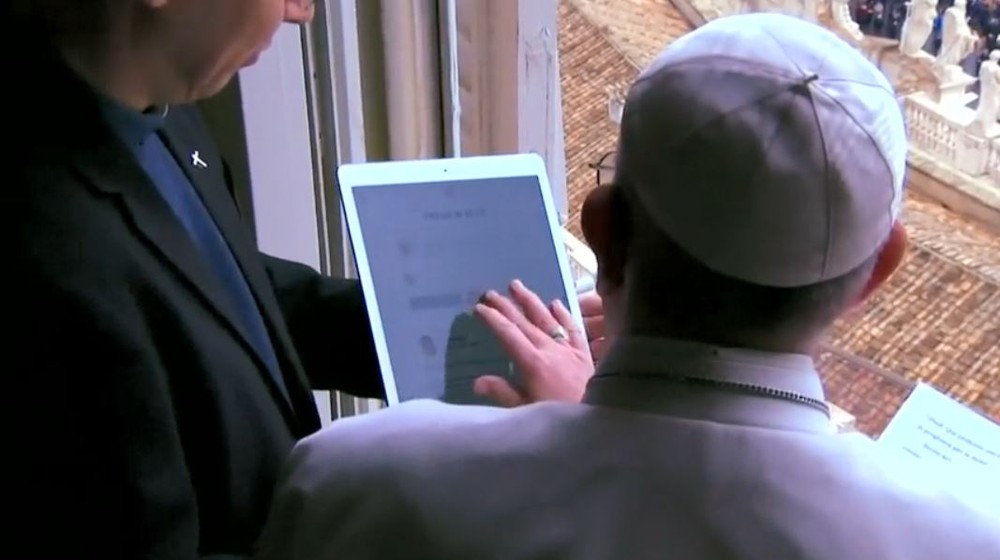 “A rede também pode nos ajudar a rezar em comunidade, a rezarmos juntos”, afirmou o papa, antes de apresentar na bancada do palácio apostólico a plataforma “Click to Pray” (Clique para Rezar), com o auxílio de um tablet.