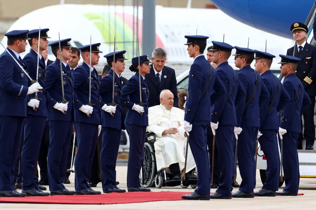 O papa Francisco, 86 anos, chegou nesta quarta-feira (2) a Lisboa para uma visita de cinco dias dedicada à Jornada Mundial da Juventude (JMJ), evento que deve reunir quase um milhão de peregrinos de todo o mundo.