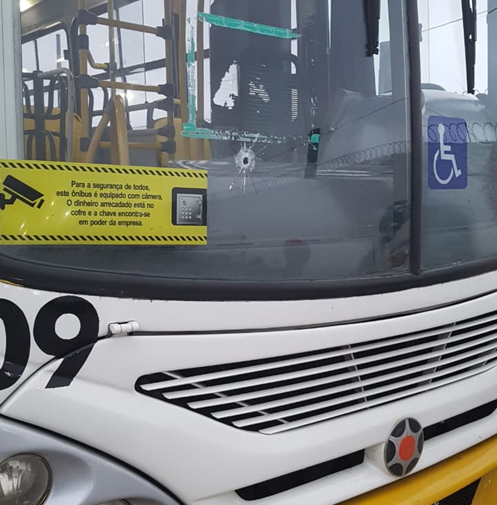 O ônibus que faz a linha 132 (Jardim Petrópolis/Petrópolis) ficou com marcas de tiros. Os criminosos conseguiram fugir, mas não levaram nada.