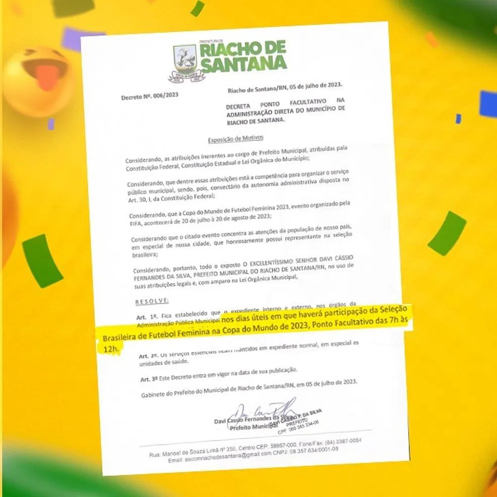 A prefeitura de Riacho de Santana, no interior do Rio Grande do Norte, decretou ponto facultativo nos órgãos da administração municipal nos dias úteis em que o Brasil jogar pela Copa do Mundo de Feminina 2023, que será disputada na Austrália e Nova Zelândia. A medida tem uma motivação especial: a presença de uma filha ilustre da cidade na Seleção, a defensora Antonia Silva.