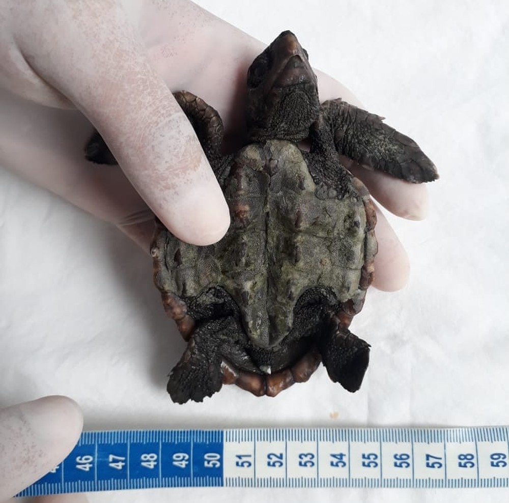 Um filhote de tartaruga marinha, de 9 centímetros de comprimento e 60 gramas, foi encontrado encalhado e expelindo resíduos sólidos na Praia de Búzios, no município de Nísia Floresta, na Grande Natal. O caso chamou a atenção de pesquisadores do RN por ser considerado raro – e inédito no estado – tartarugas nesta fase de desenvolvimento ingerirem lixo, além de pouco registrado também o encalhe nesta idade. Ela foi resgatada.