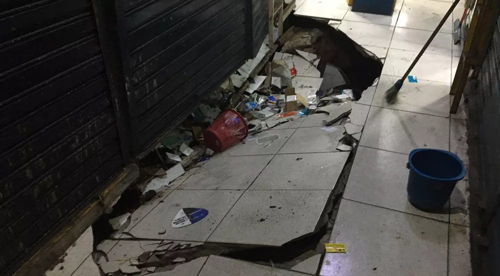 O piso do Camelódromo do Alecrim, em Natal, cedeu na manhã dessa sexta-feira (8). Foram identificados problemas no sistema de drenagem, localizado abaixo do centro comercial.