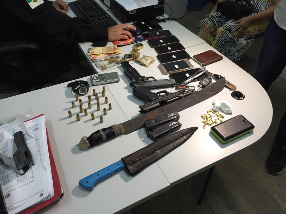 Eles levaram os policiais a outras cinco pessoas na Redinha. Lá foram encontradas a pistola .40, drogas, munições intactas, dois carregadores, um simulacro de arma de fogo, uma balança de precisão, drogas e dois facões.