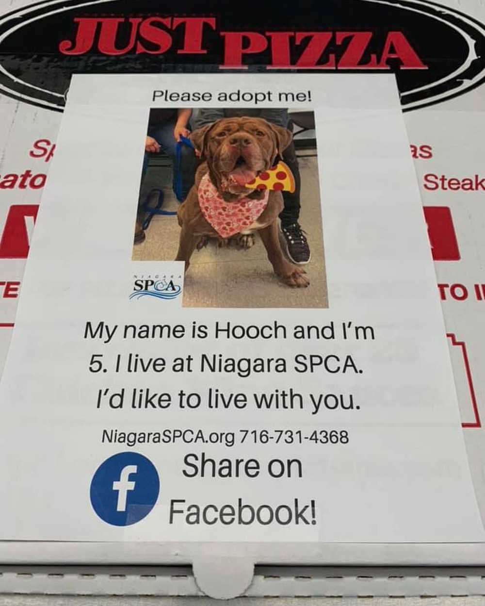 Uma pizzaria de Nova York, Estados Unidos, tem colocado nas suas embalagens de entrega fotos de cachorros que precisam ser adotados. Além de ajudar os animais, quem adota um dos cãezinhos ganha um voucher de US$ 50 para gastar na pizzaria.